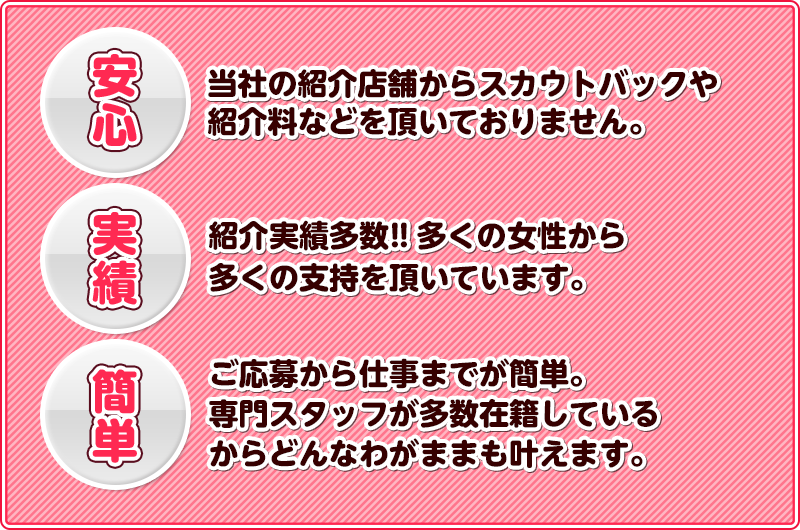 ◎ 業界が初めての子でも登録とカウンセリングだけで、後は当社にお任せください。スカウトバックは無いので、お給料も満額支給されます。 |